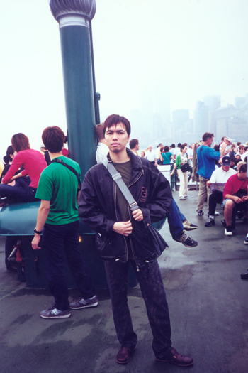 2001 年九一一事件前幾天我在世貿中心前拍照留念 , 當天陰雲密布 , 我背後兩楝世貿中心祇能依稀看到